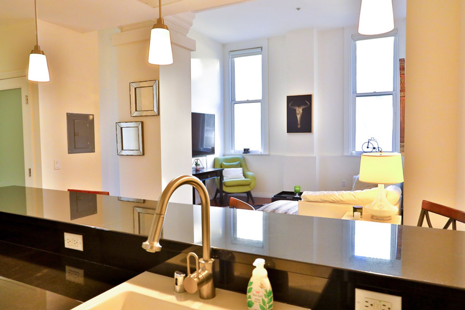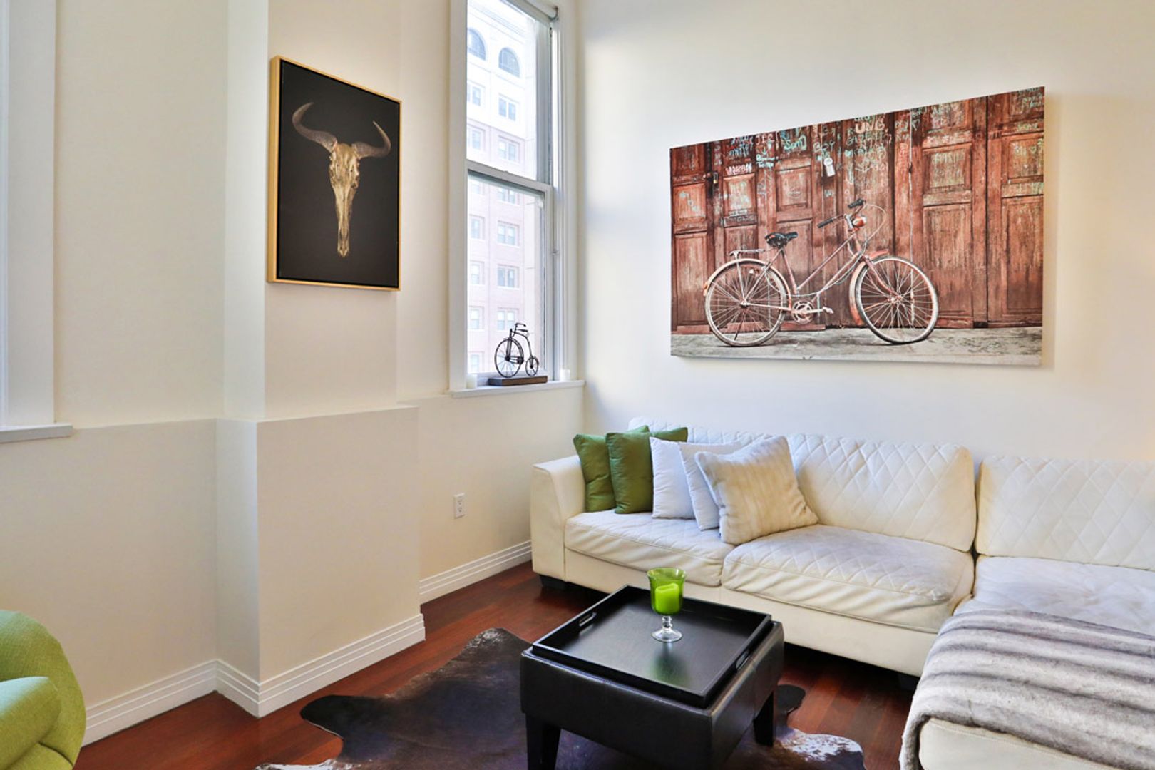 Corner 2-bedroom with downtown views, soaring ceilings, oversized windows, and a walk-in closet—elevated city living at Blackstone Residential.